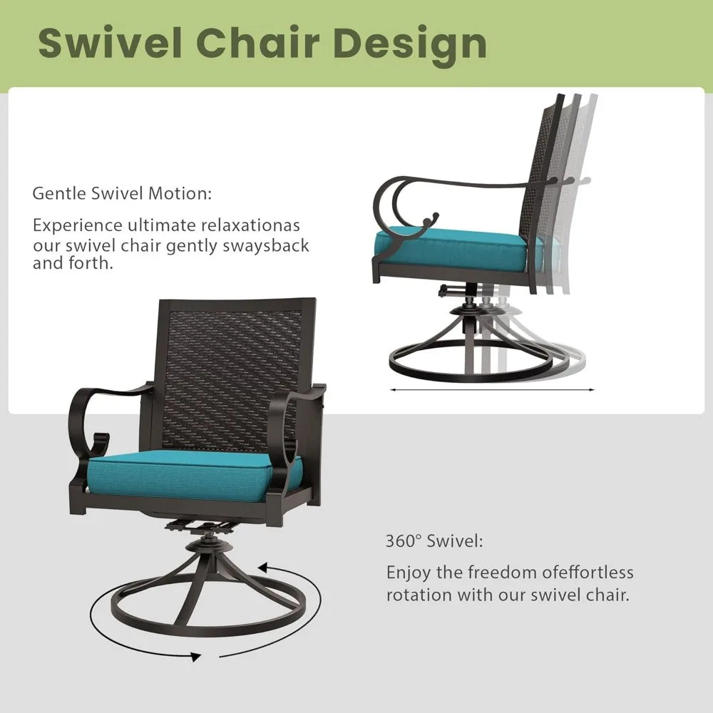 - Includes four blue rattan swivel chairs and a rectangular, 36-inch-deep table in a stylish 5-piece configuration to fit cozy alfresco meals.